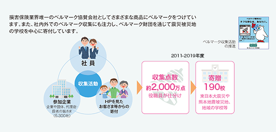 子供のころを振り返れば、誰もが覚えのあるベルマーク。あいおいニッセイ同和損保は、損保業界唯一のベルマーク協賛企業として、対象の商品にご加入いただいたお客さまにベルマークをお渡ししています。このように、当社では保険商品を通じた社会貢献活動を行うことで、地域社会とのつながりを深めています。2011年より実施しているベルマーク収集活動では、2019年度までに約2,000万点を収集。収集したベルマークは、東日本大震災や熊本地震被災地の学校を中心とした計190校(2019年度は21校)に寄贈しています。